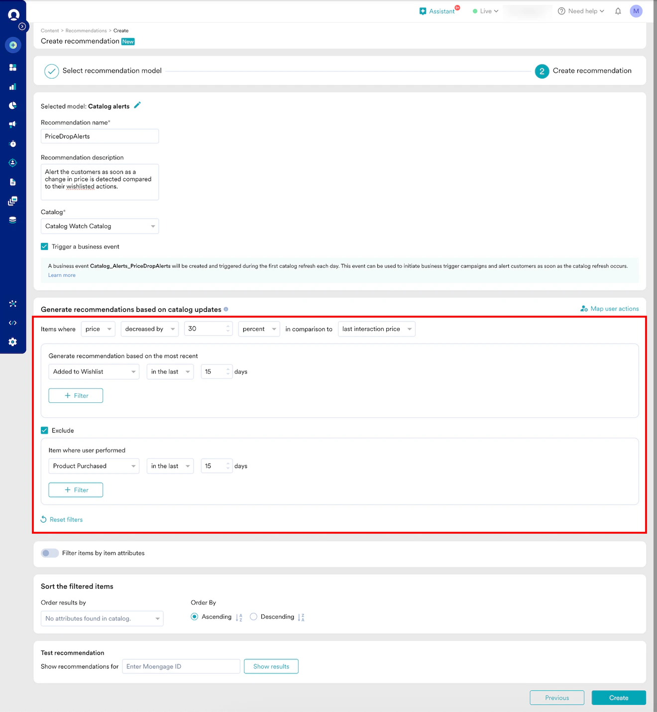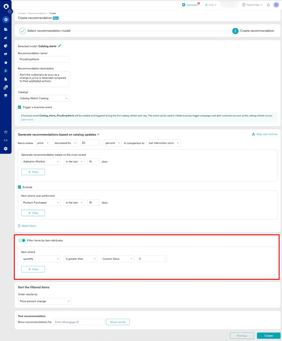 - In the Sort the filtered items section, sort the recommendation results by MoEngage-derived attributes or any other numeric catalog attribute (for example, in the Order results by list, select Price percent change to sort the results from the highest to lowest).