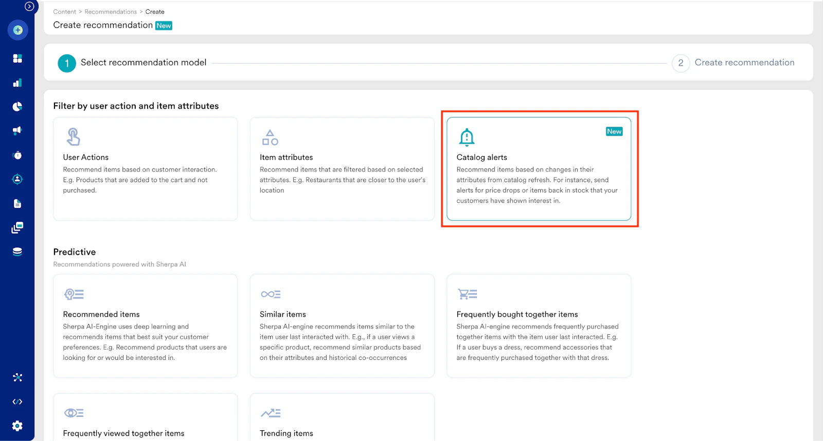 - Click the Catalog alerts model and click Next. You are taken to the second step, Create recommendation.