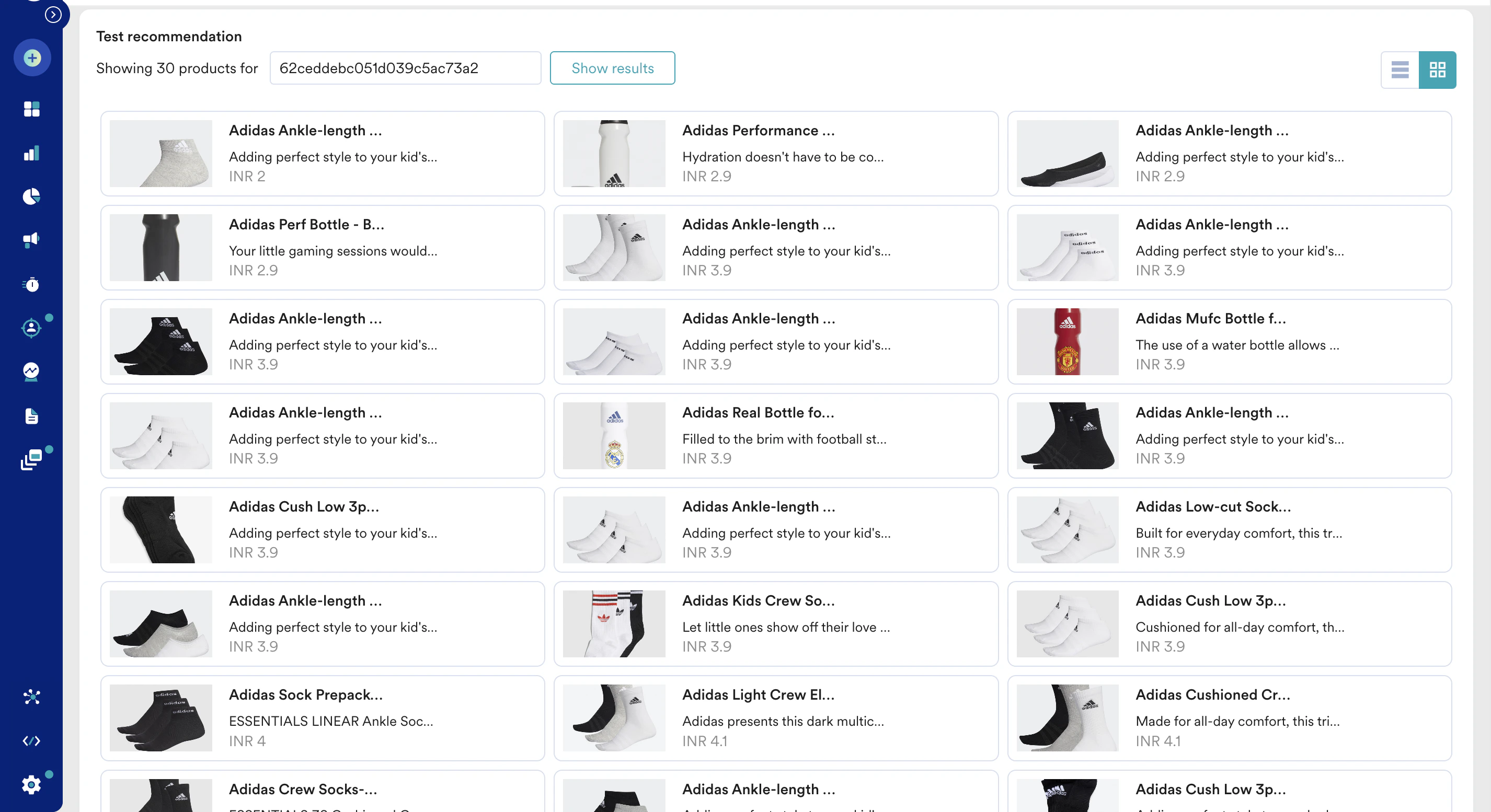 At the bottom of the recommendation settings, you can find the Test recommendation option. Enter the unique MoEngage ID of your customer and click Show results to see the results for a user at this particular time.