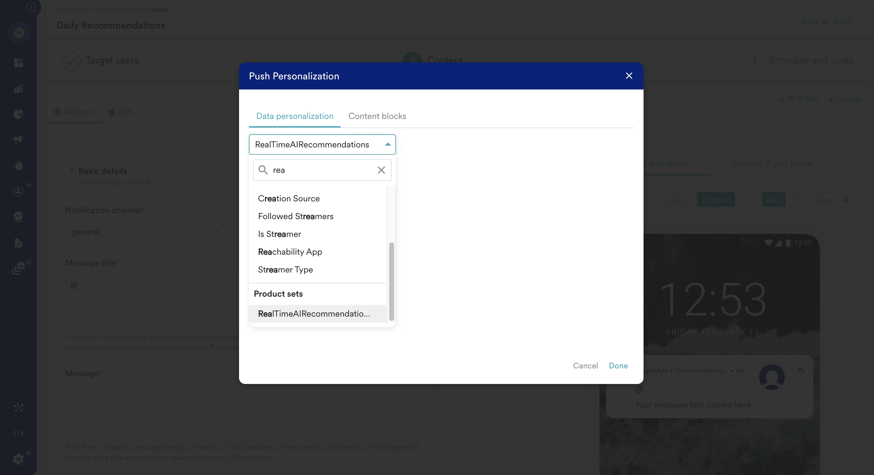 - On entering ’@’ in any text block, a personalization pop-up opens. Search the recommendation name under data personalization drop-down and click Done.