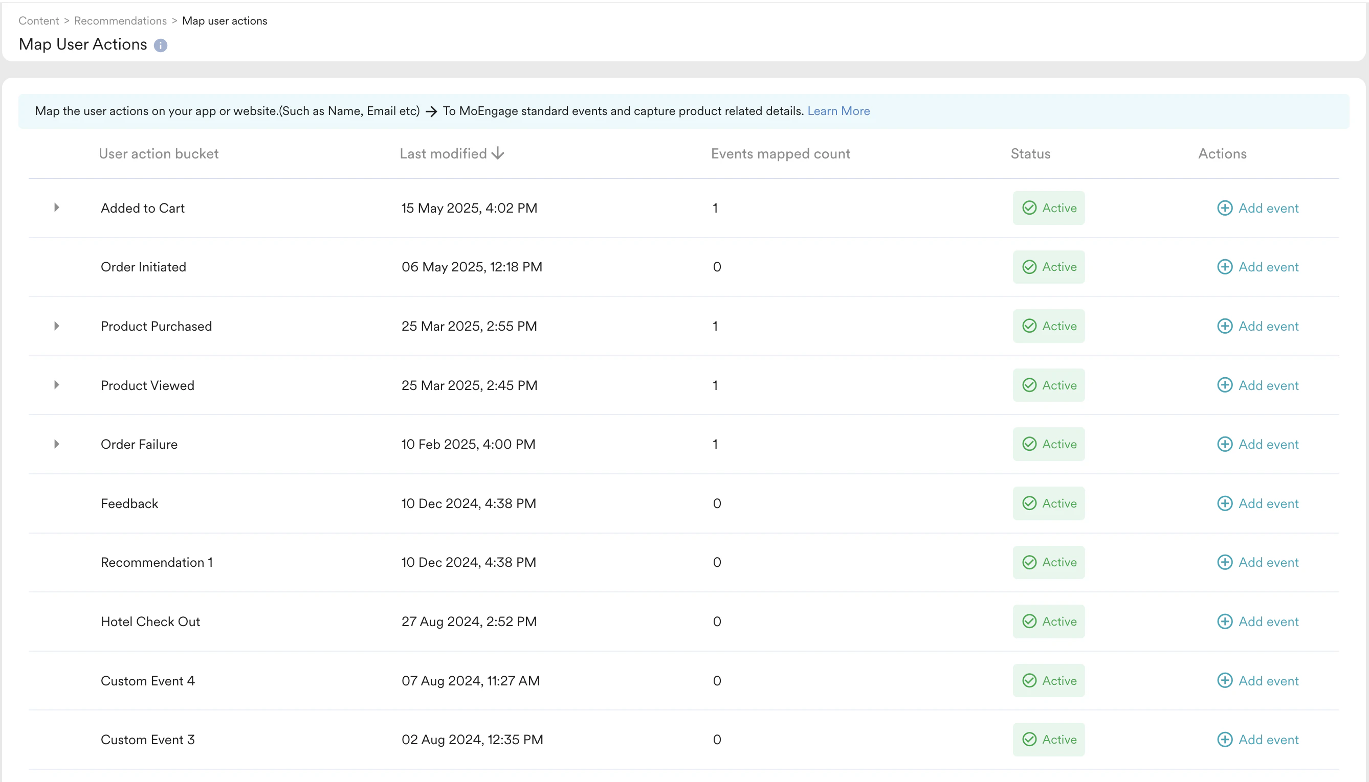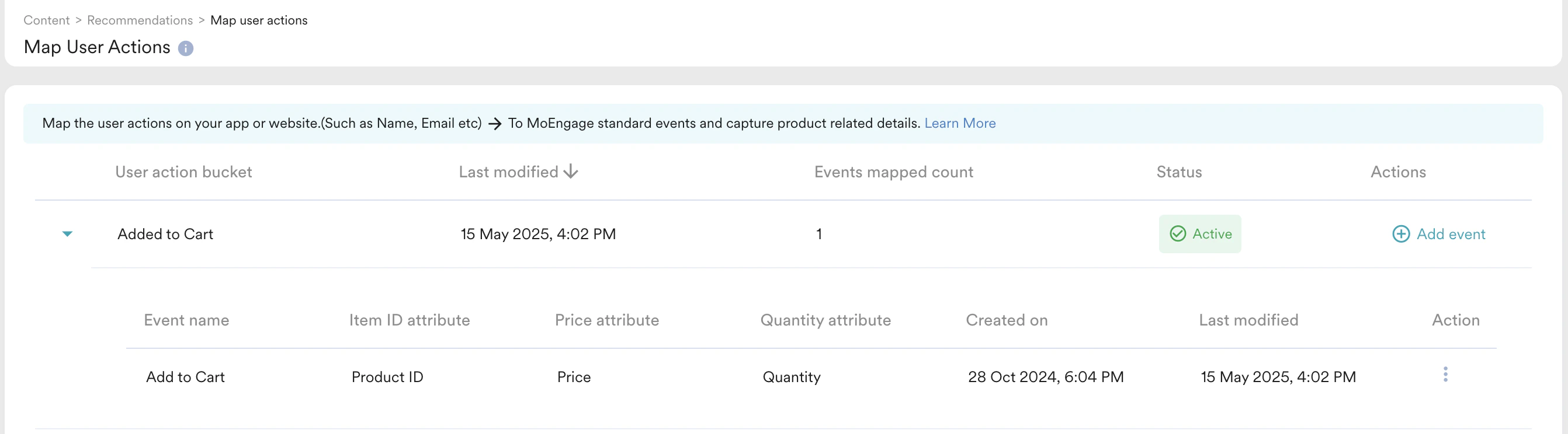 - MoEngage Recommendations Start listening to this user event-attributes combination for all such events performed after mapping time. You can check the event mapping time by expanding a bucket.