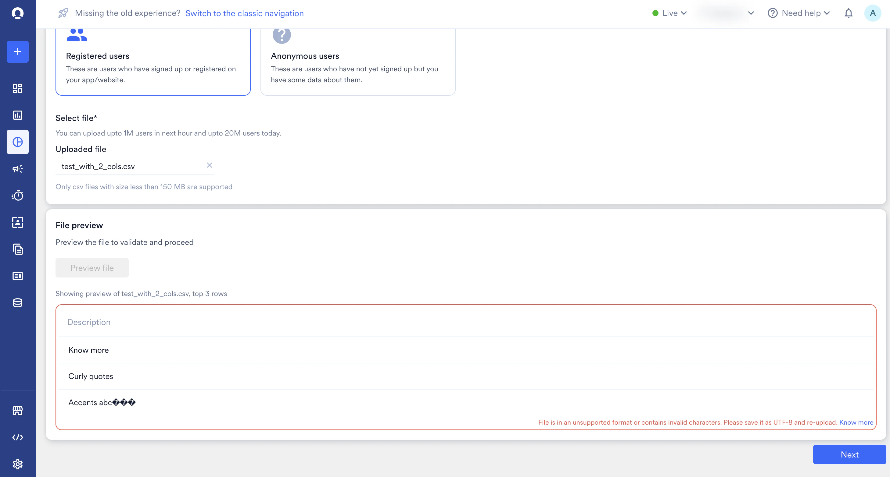 With a correctly formatted UTF-8 file, MoEngage supports:- Standard alphanumeric characters: a-z, A-Z, 0-9.