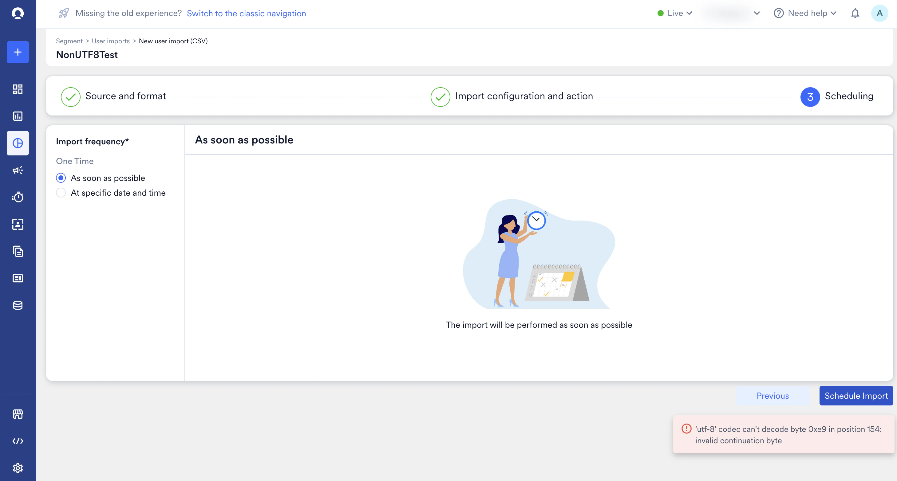 The following can cause import errors even if the file is UTF-8 encoded:- Complex Attribute Types: You cannot import complex data like JSON objects, dictionaries, or lists directly into a single CSV field.