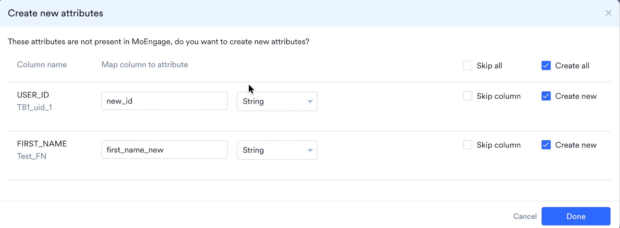 - Any columns mapped to a non-existent MoEngage attribute (which you choose not to create via the modal) will be left blank for manual mapping.