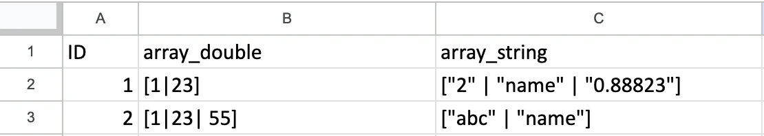 • All the elements in the array have to be homogenous, which means they must be either integer or string. If they are not homogenous, MoEngage tries to typecast (transform) the element and then store the data. Following is the example of an array in a CSV field: [1|2|3]