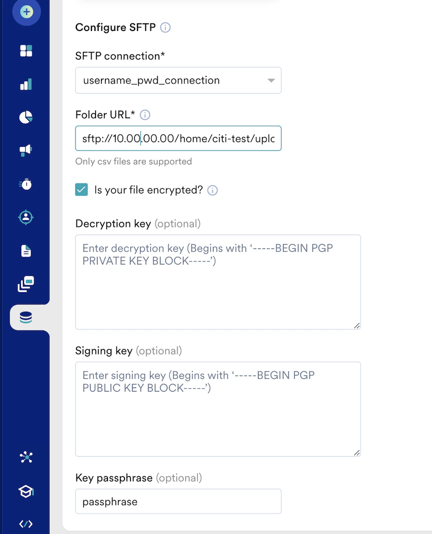 | Decryption Key | Type the decryption key. This field will be visible when you select the Is your file encrypted? check box. This is your private PGP key. You can generate the PGP keys by yourself or have MoEngage generate them. Example: -----BEGIN PGP PRIVATE KEY BLOCcK----- xcMGBGVqq74BCADKpWRLSAdcTtDKpT+LCUCqDoZQ2dlgeBiXNovBVyTPlAOPQSqX bnNGs+U4RpHebjvTxaWCLDBGYOvtZbtv6WvPIF7lzXrIv+DcgLMBQp2b3t+ohRBi 41Ch8CZ04F2lxbVBo -----END PGP PRIVATE KEY BLOCK----- |