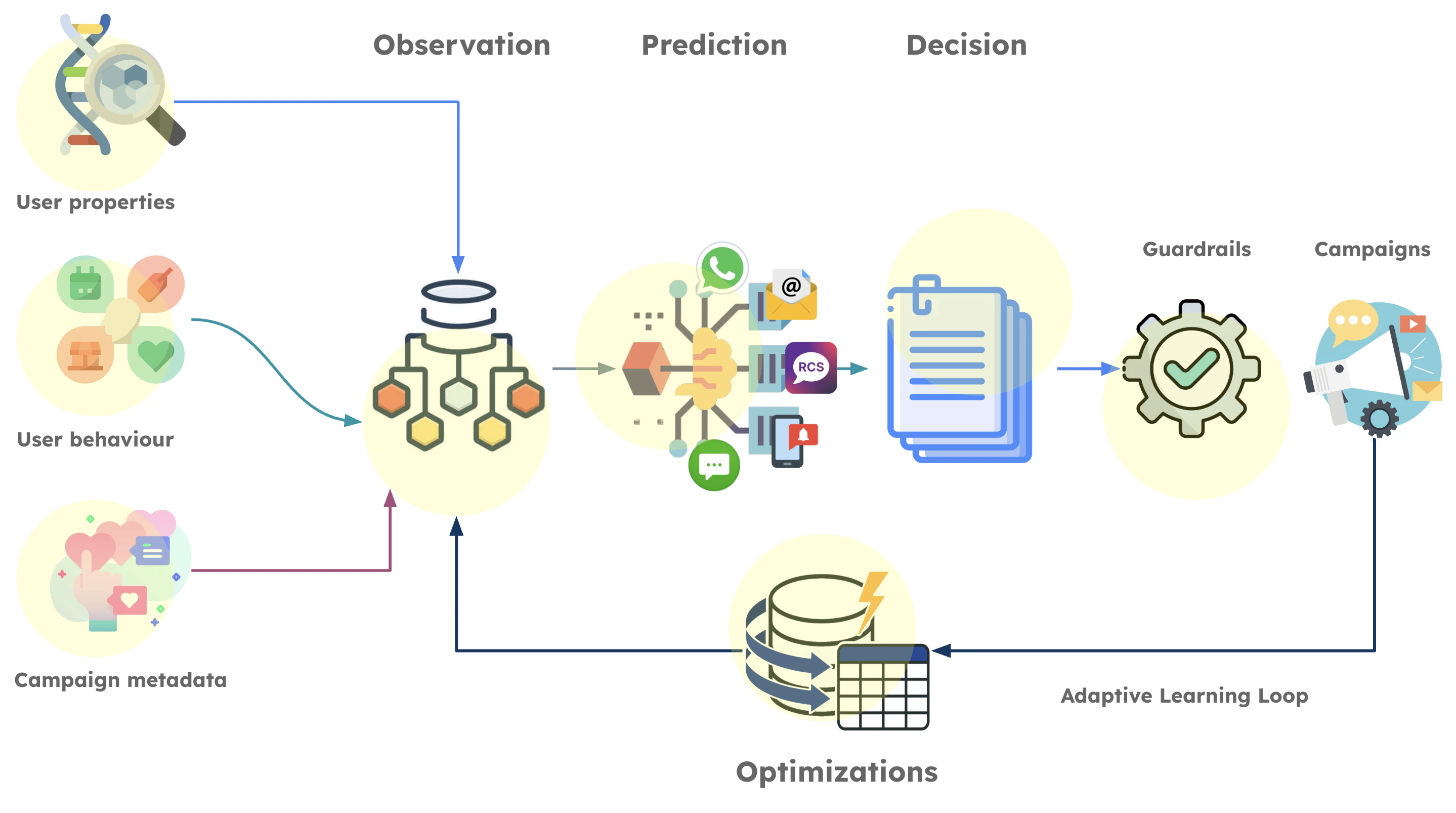 When a user becomes eligible for engagement, the agent’s intelligence engine executes the following process:- Observation: The agent gathers the current state of the user to model intent. It analyzes user properties, aggregated behavior (such as purchase frequency and average order value), and the semantic similarity of campaigns. This calculates how closely campaign content aligns with the evolving interests of both the individual and their lookalike audiences.
