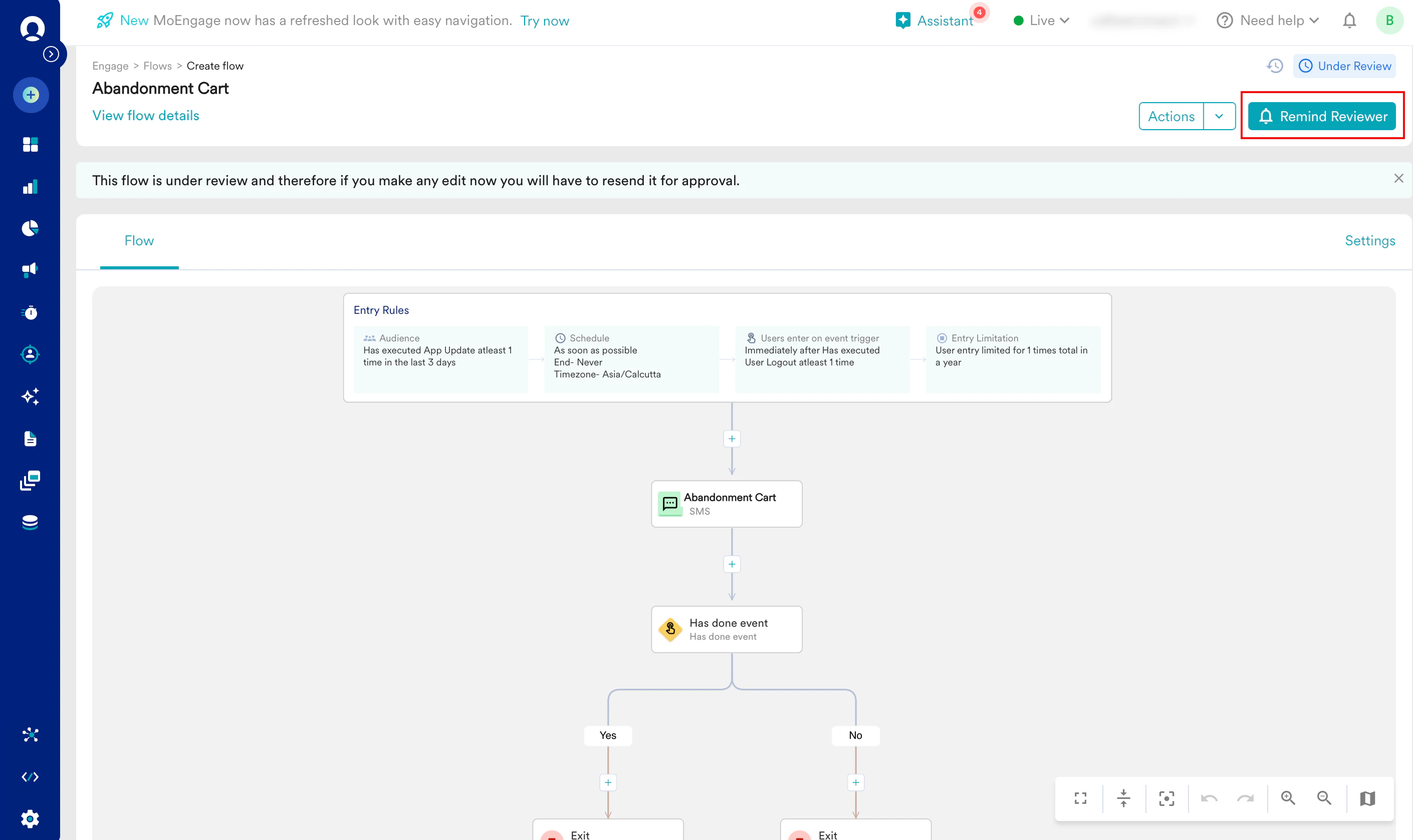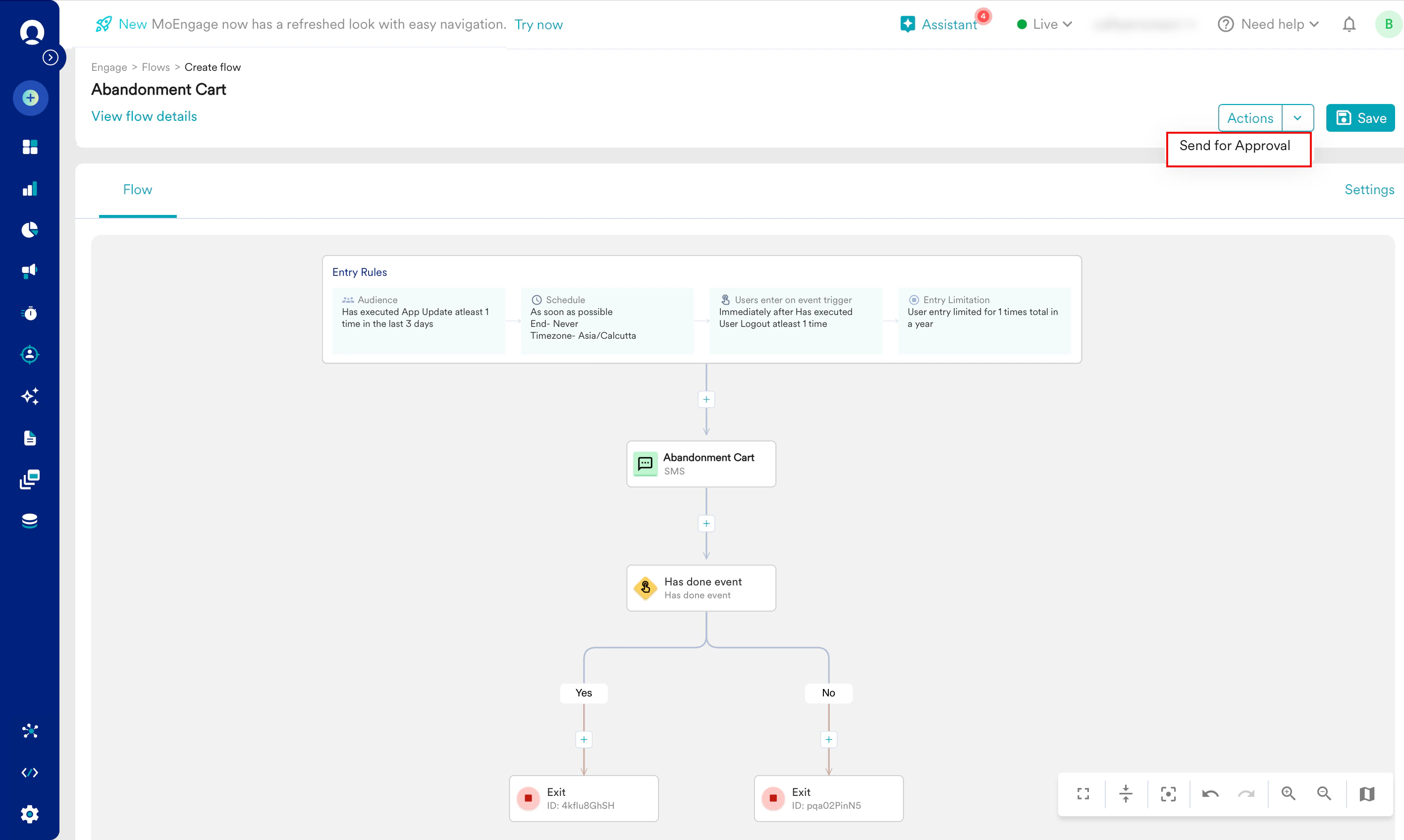 - If the Campaign Approval workflow is enabled and you only have the Create & Manage permission, you must submit the flow for approval. For more information, refer here.