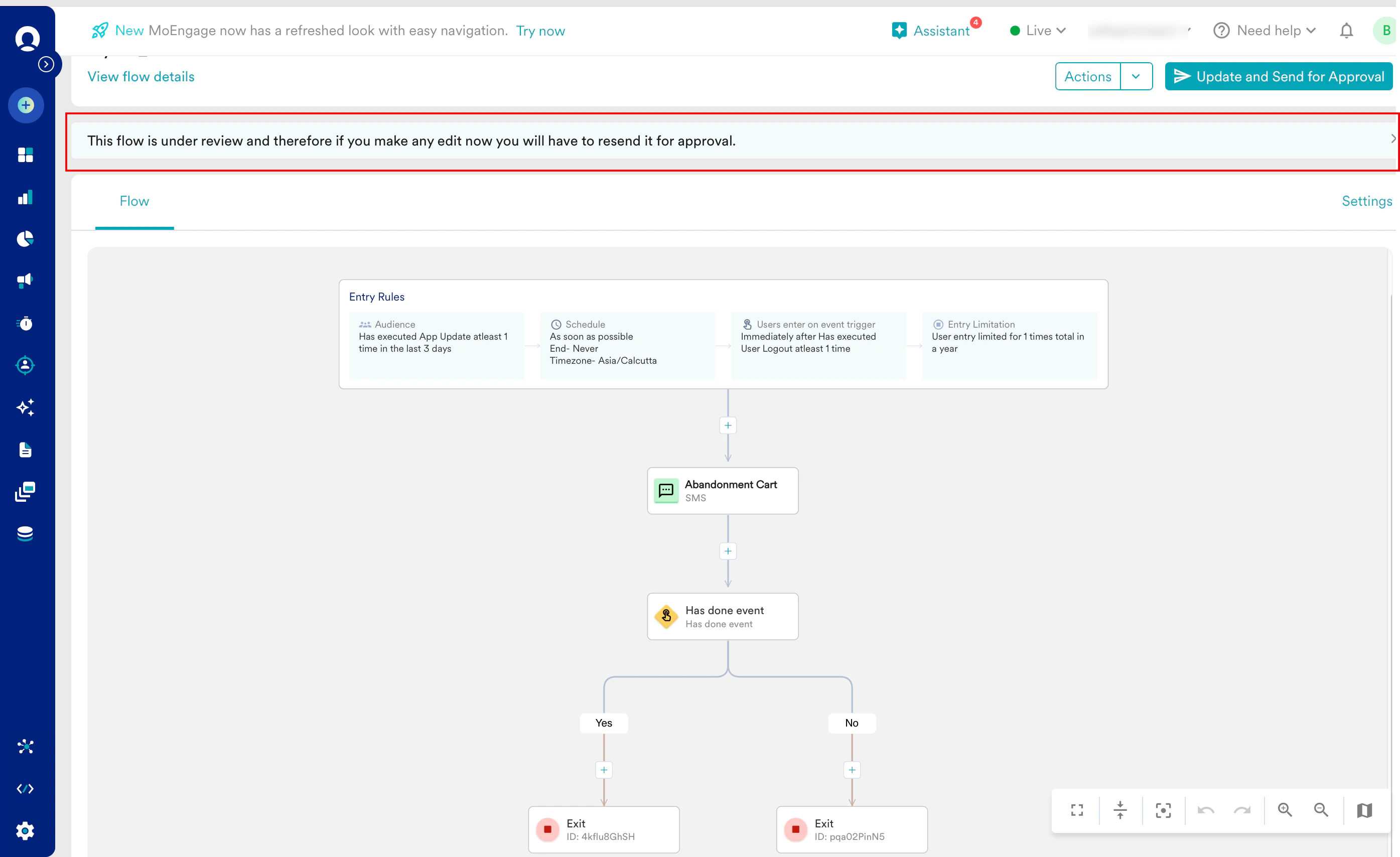 - Edit the flow: You can edit a flow that is Under Review. After making the edits, you must resend the flow for another review by clicking Update and send for approval. Then, repeat steps 3 through 5.