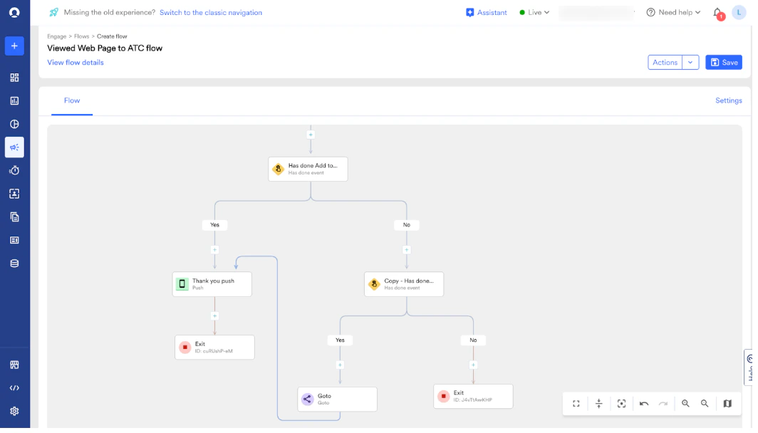 - If users do not meet the Has done event (first condition), you can copy and paste the Has done event stage as a second condition by merging the Yes paths from both conditions by adding the GoTo stage to cover the entire 60-day period. This modular design provides greater clarity and control over your logic to leverage the new engine’s performance benefits.