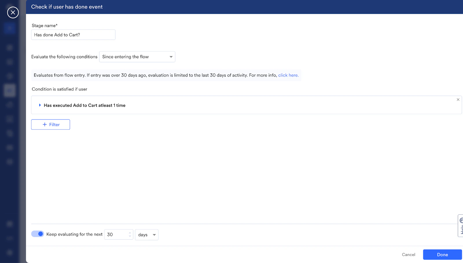 - In the Has done event stage (first condition), check for the Added to Cart event and turn the Keep Evaluating for toggle on and set the time window to 30 days.