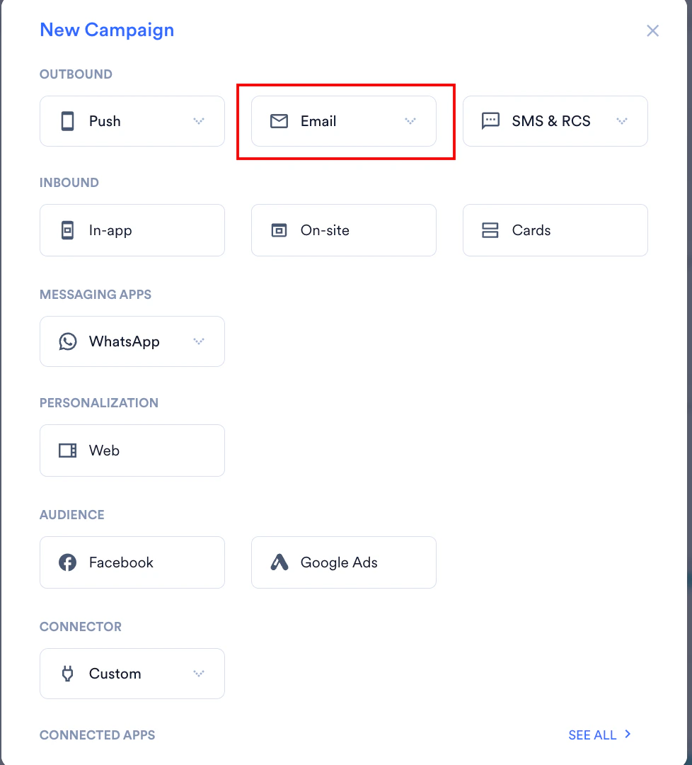 On the New Campaign dialog box, under OUTBOUND, click Email.