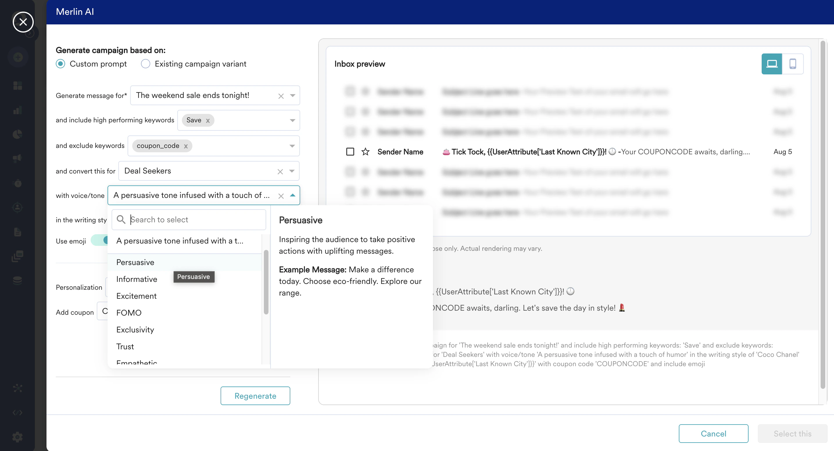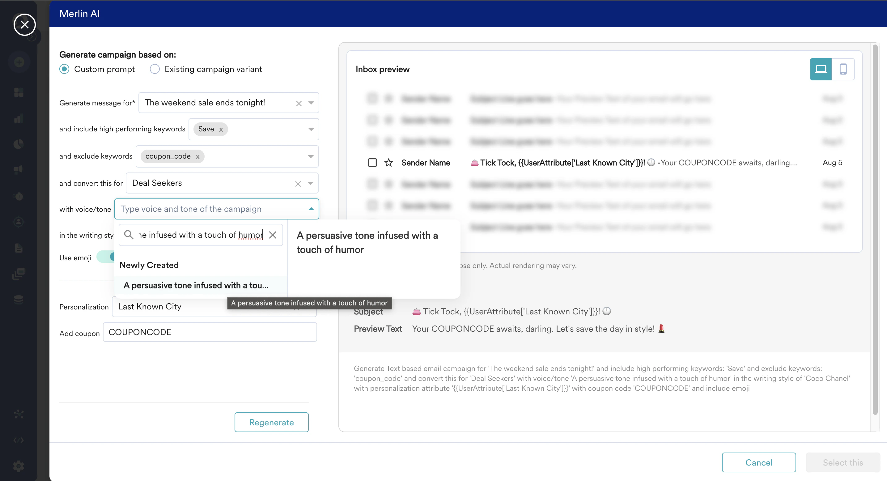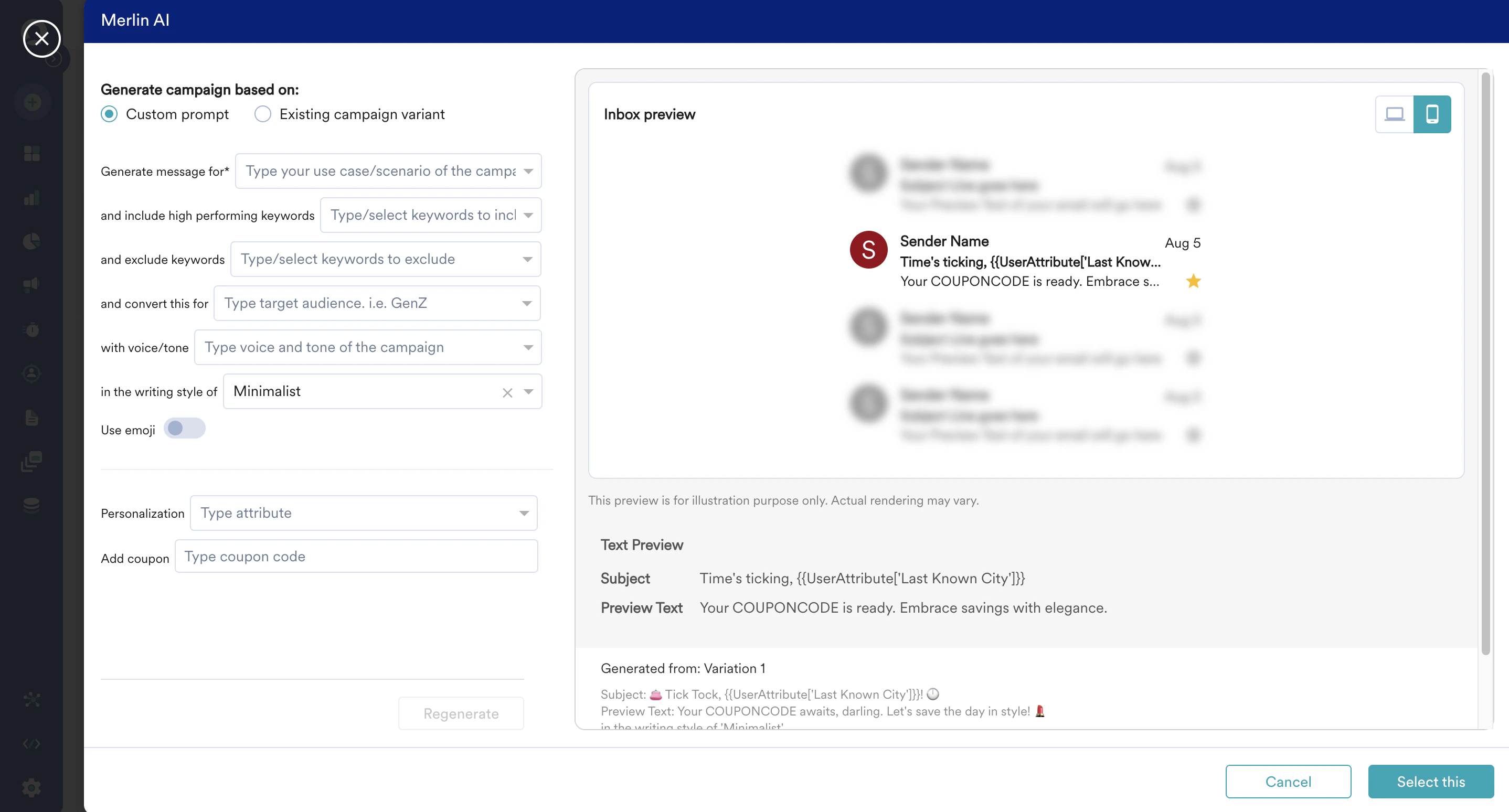 - Sometimes you may need to customize the generated content with extra information. For example, the use case may include adding your coupon code that Merlin AI may not know. In such cases, enter the coupon code in the Add Coupon field in the Merlin AI prompt builder.