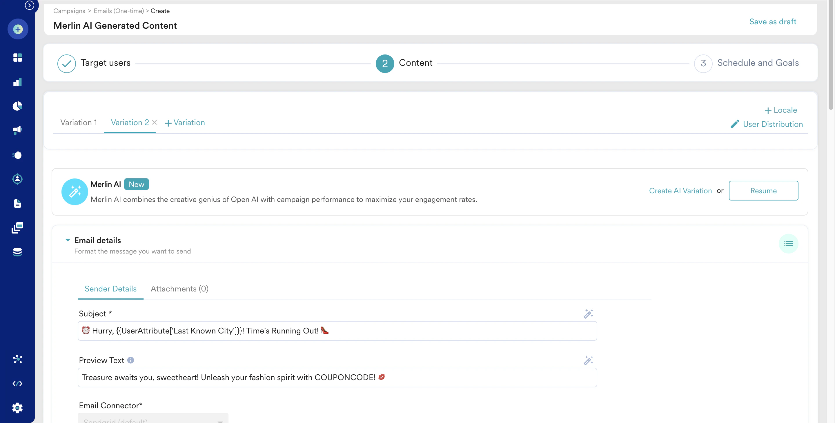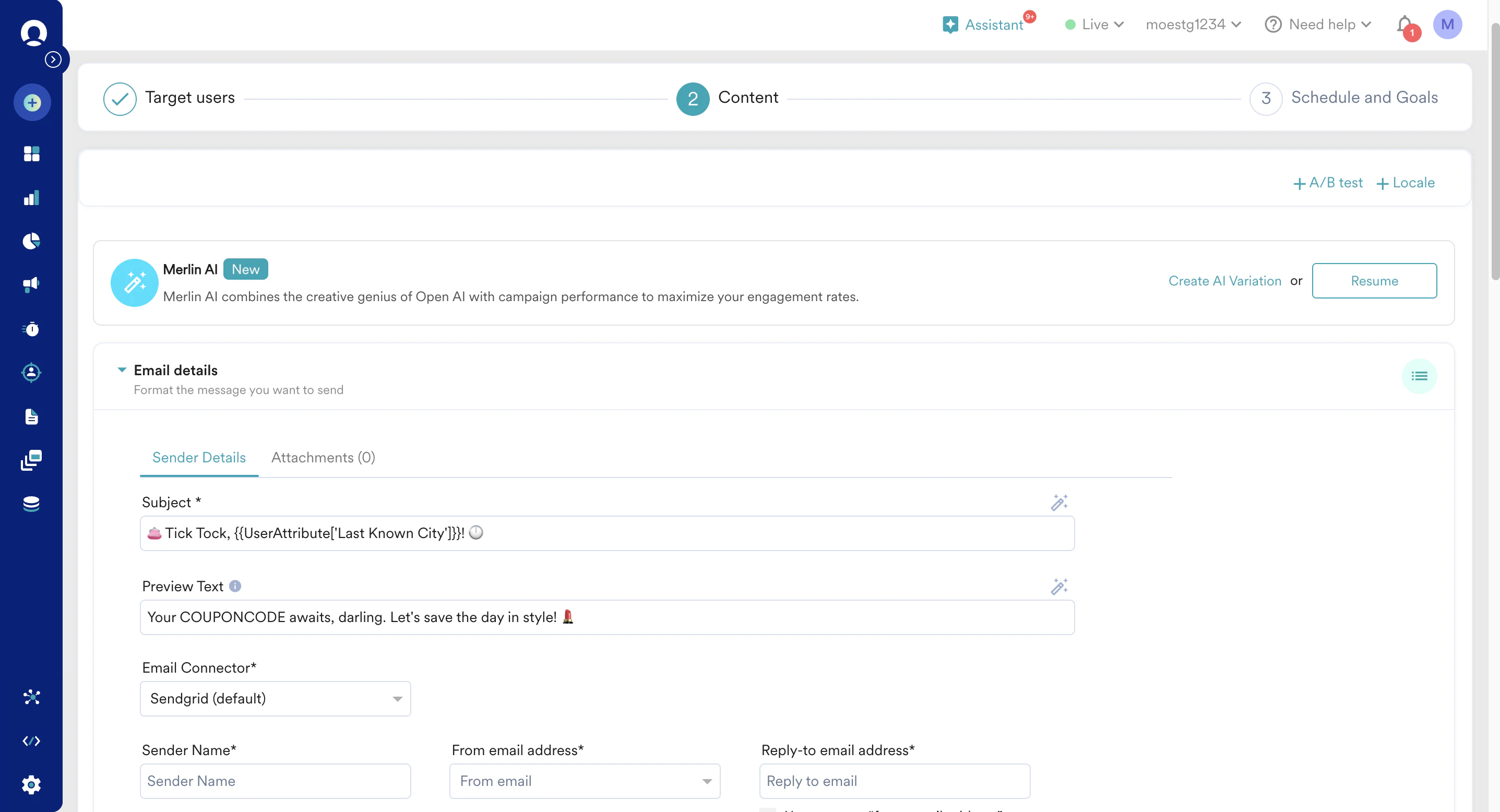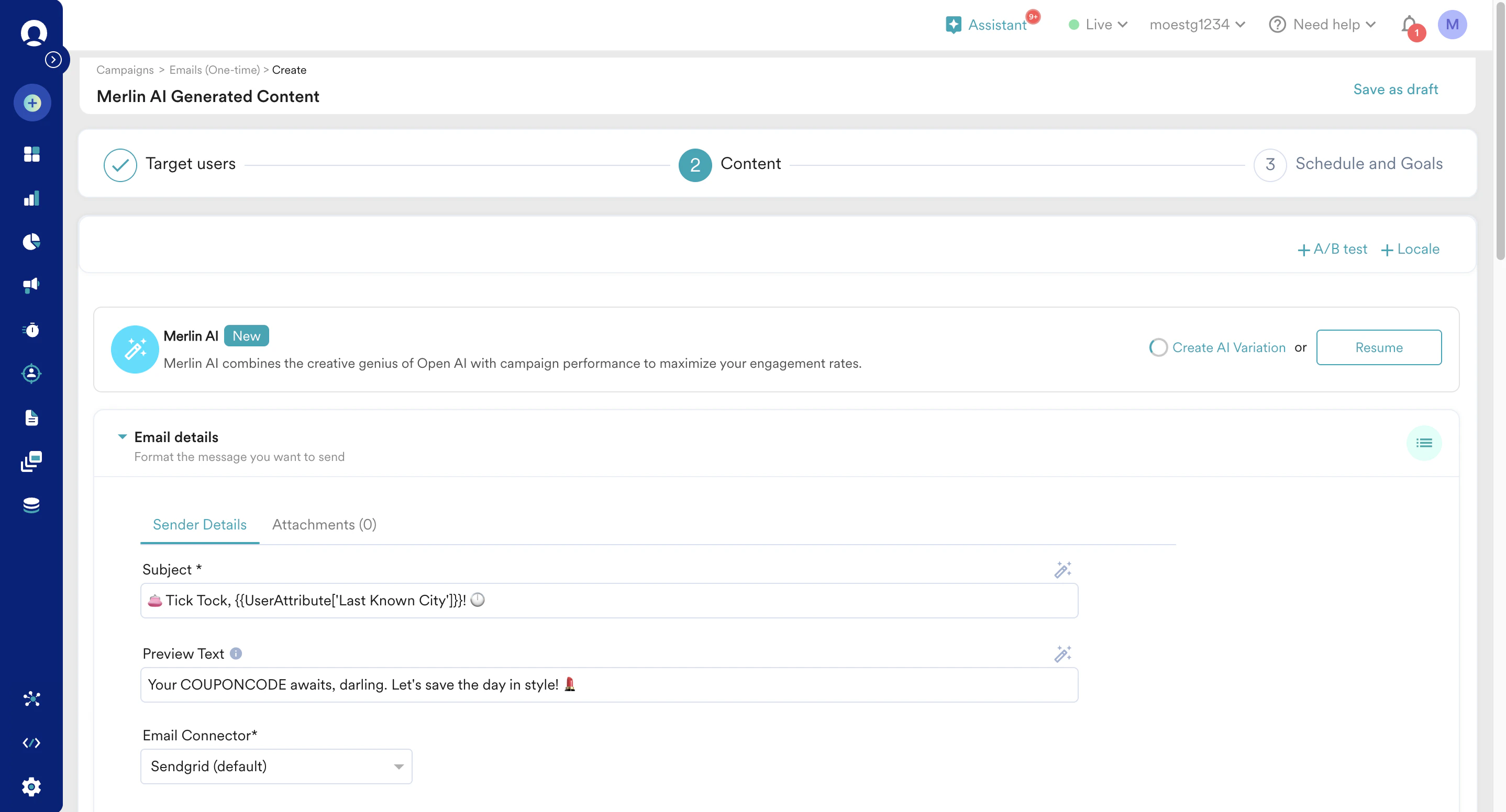 - Sometimes you may need to customize the generated content with extra information. For example, the use case may include adding your coupon code that Merlin AI may not know. In such cases, enter the coupon code in the Add Coupon field in the Merlin AI prompt builder.