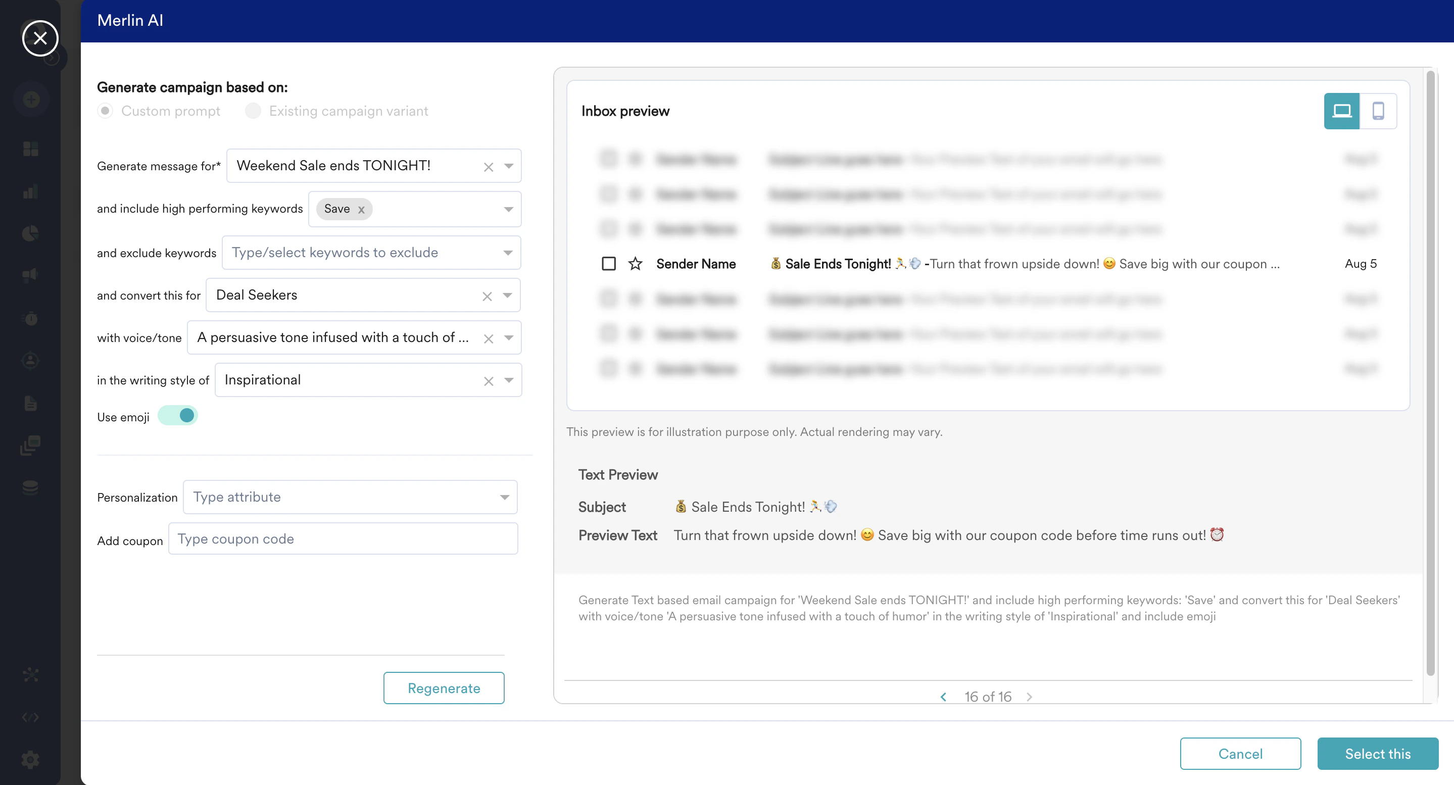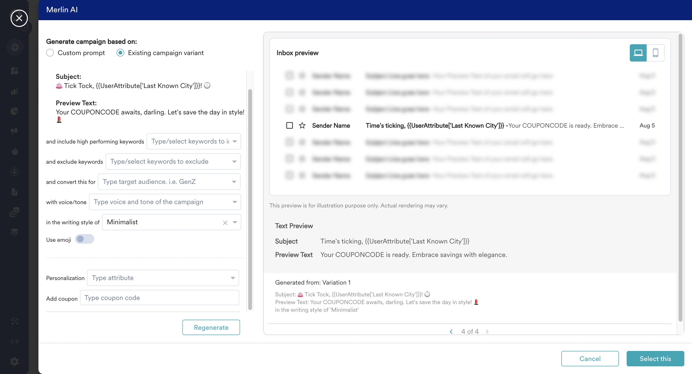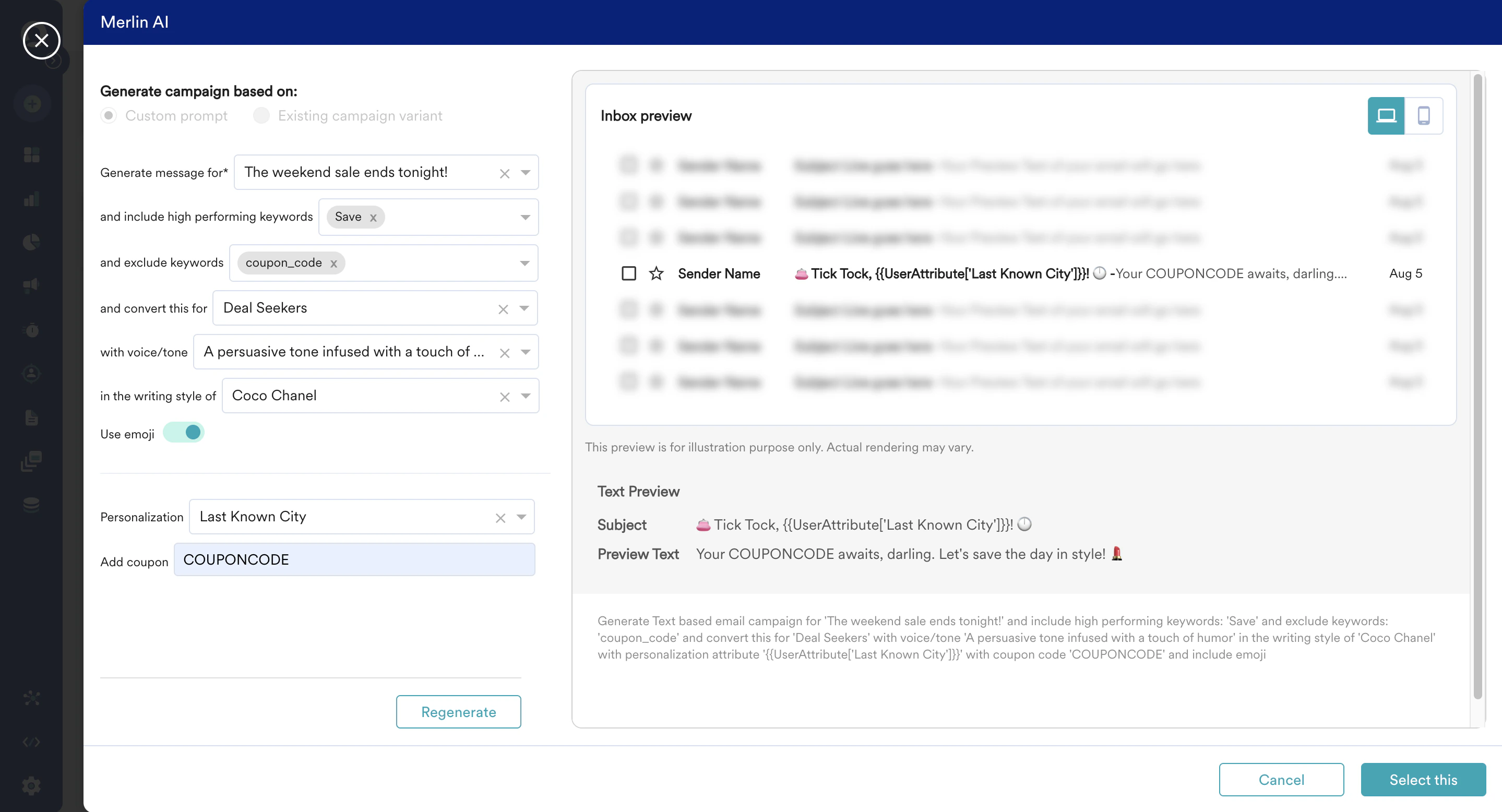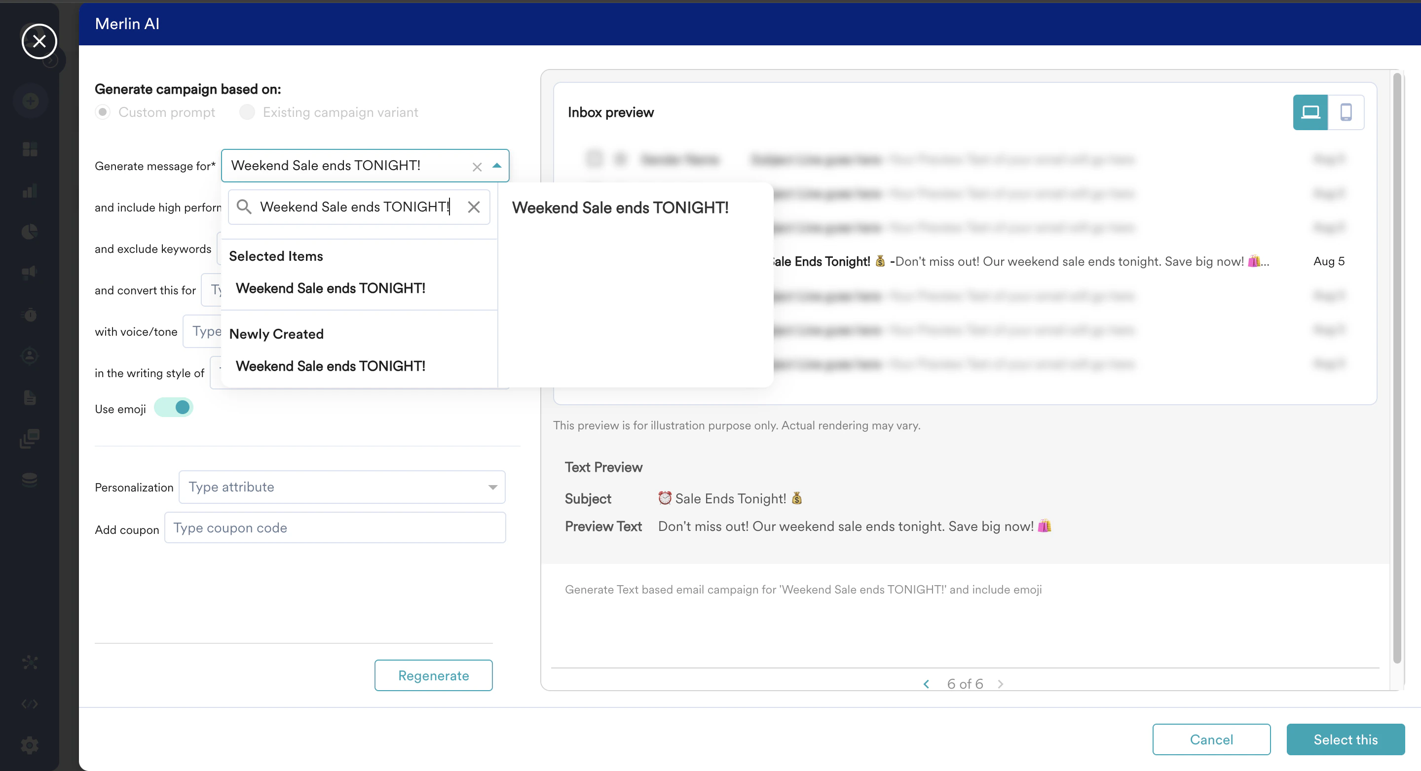 - If you find a content that you like, click on “Select this” and the subject lines and preview text of the Email will be automatically filled with the generated content.