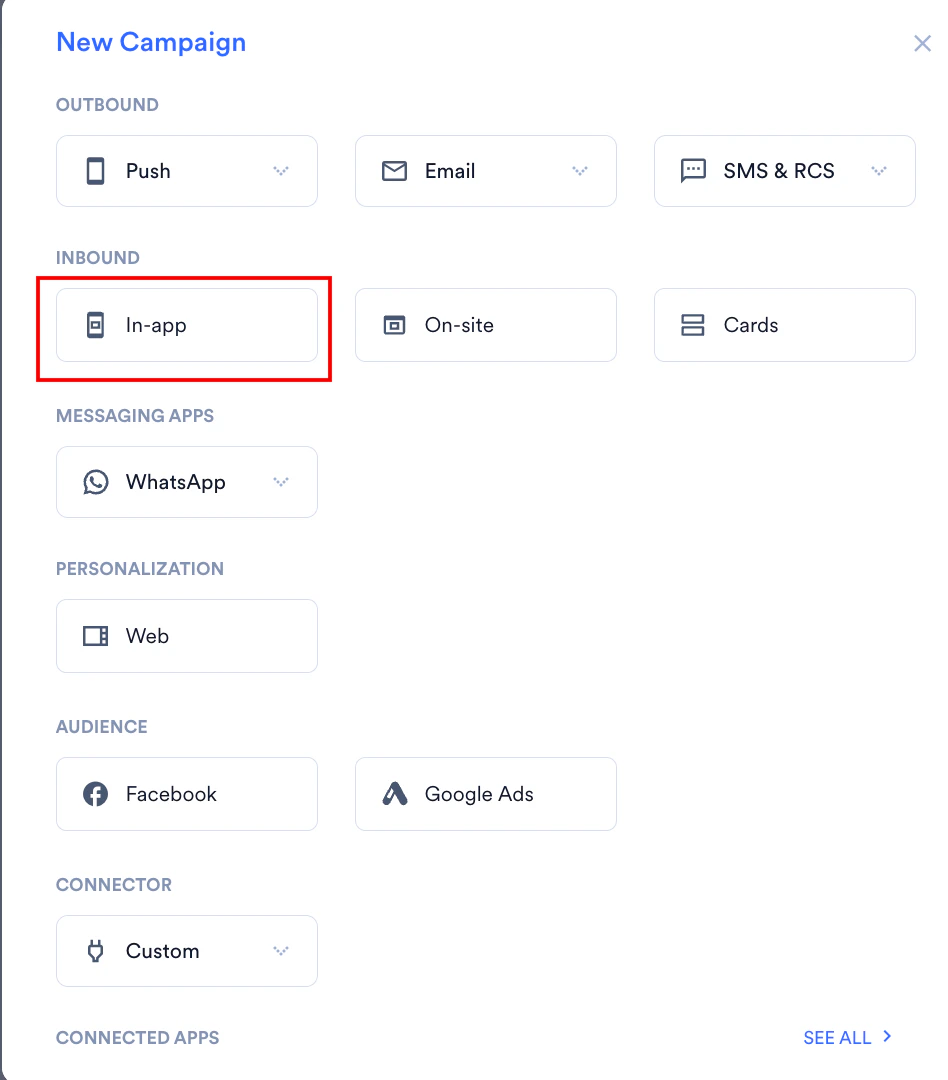 You can also click All Campaigns on the Engage menu and then click + Create campaign on the All campaigns page. - On the New Campaign dialog box, under INBOUND, click In-app. The In-app creation page appears.