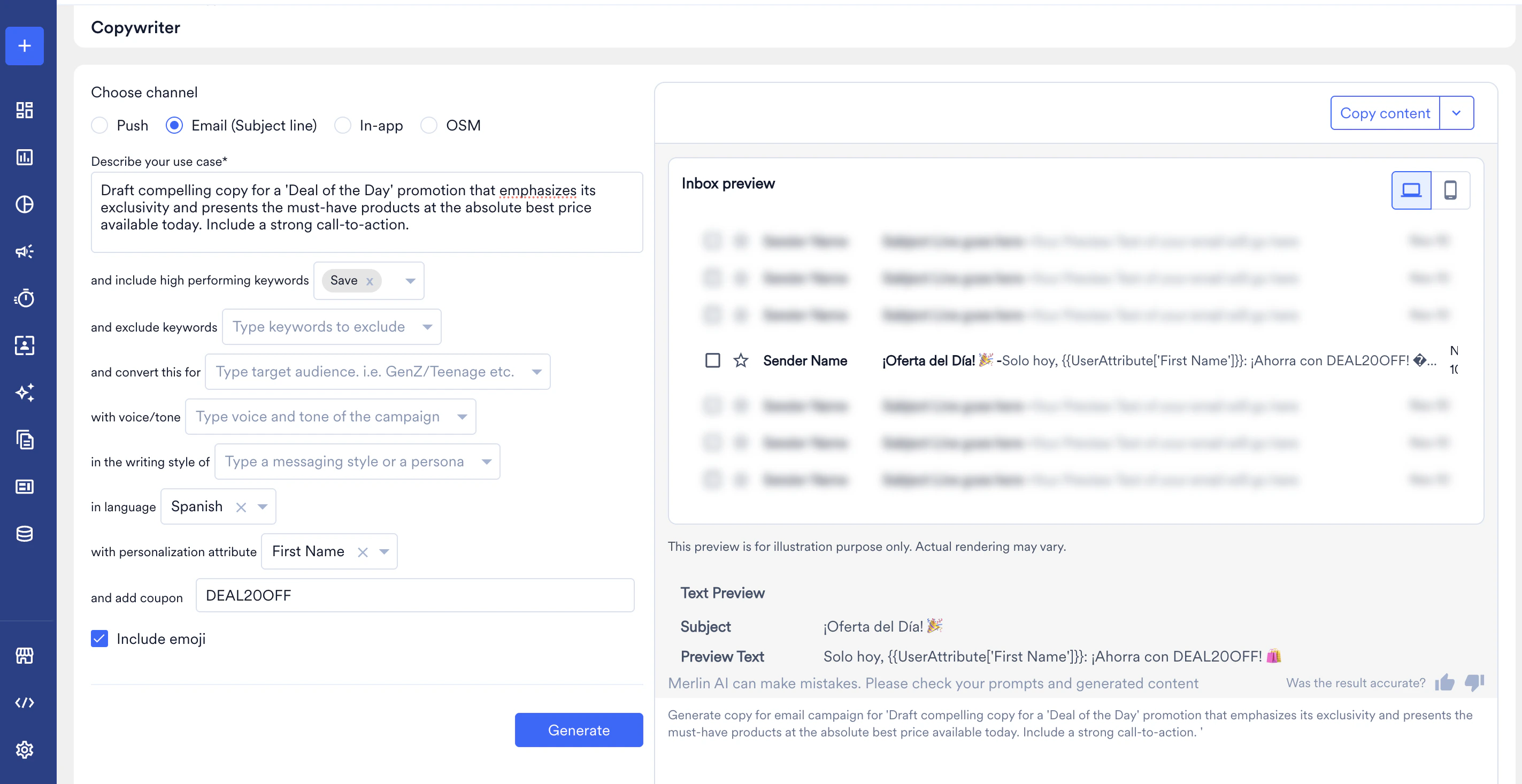 The Merlin AI Studio serves as the centralized hub for utilizing MoEngage’s Generative AI features. It’s designed to simplify your workflow by consolidating all AI agents into one intuitive interface. To access an agent from the Merlin AI Studio page, perform the following steps: