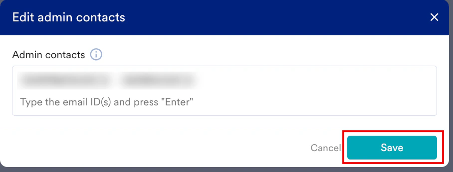 - On the Edit admin contacts pop-up window, edit the existing admin contacts as necessary. You can add multiple email addresses, separate them with a comma, and press Enter.