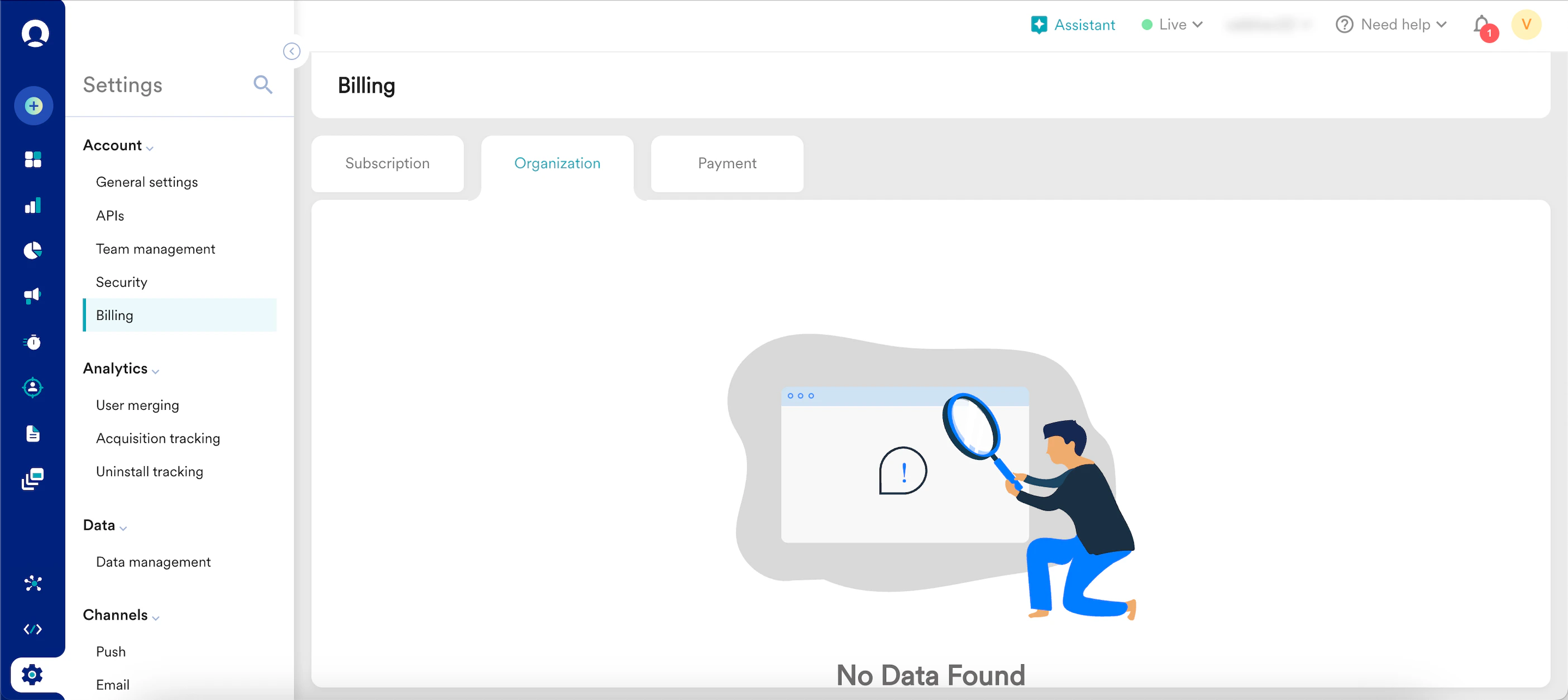 - On the left navigation menu in the MoEngage dashboard, click Settings > Billing.