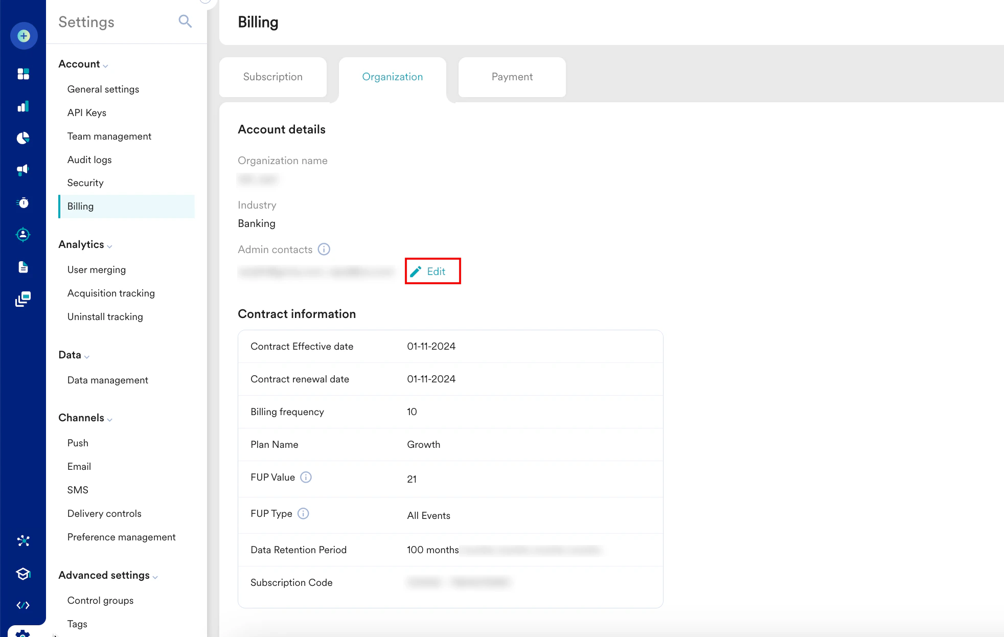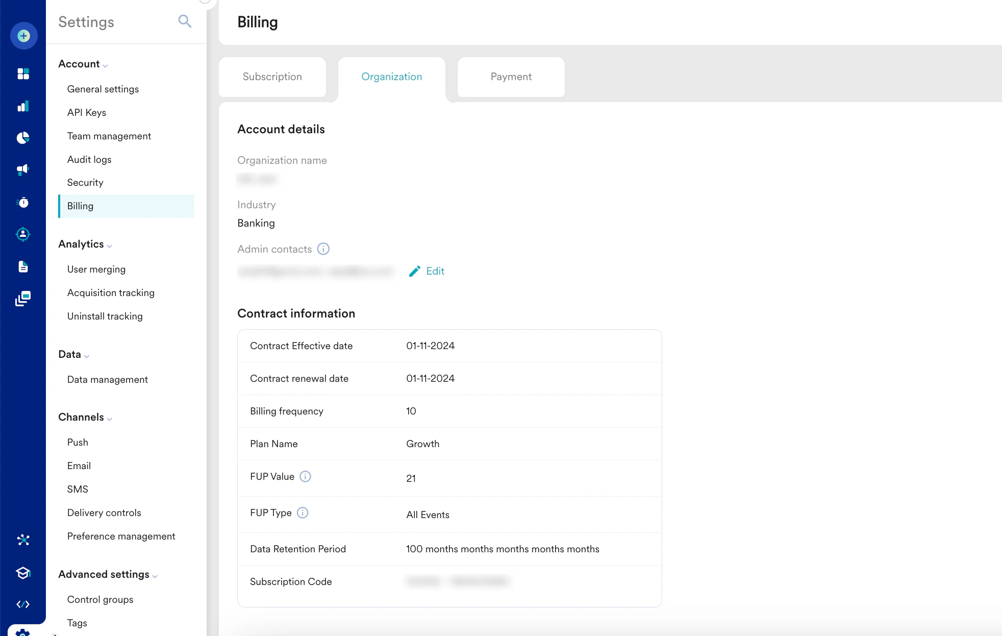 - Billing frequency: The field shows the frequency at which the organization is billed.