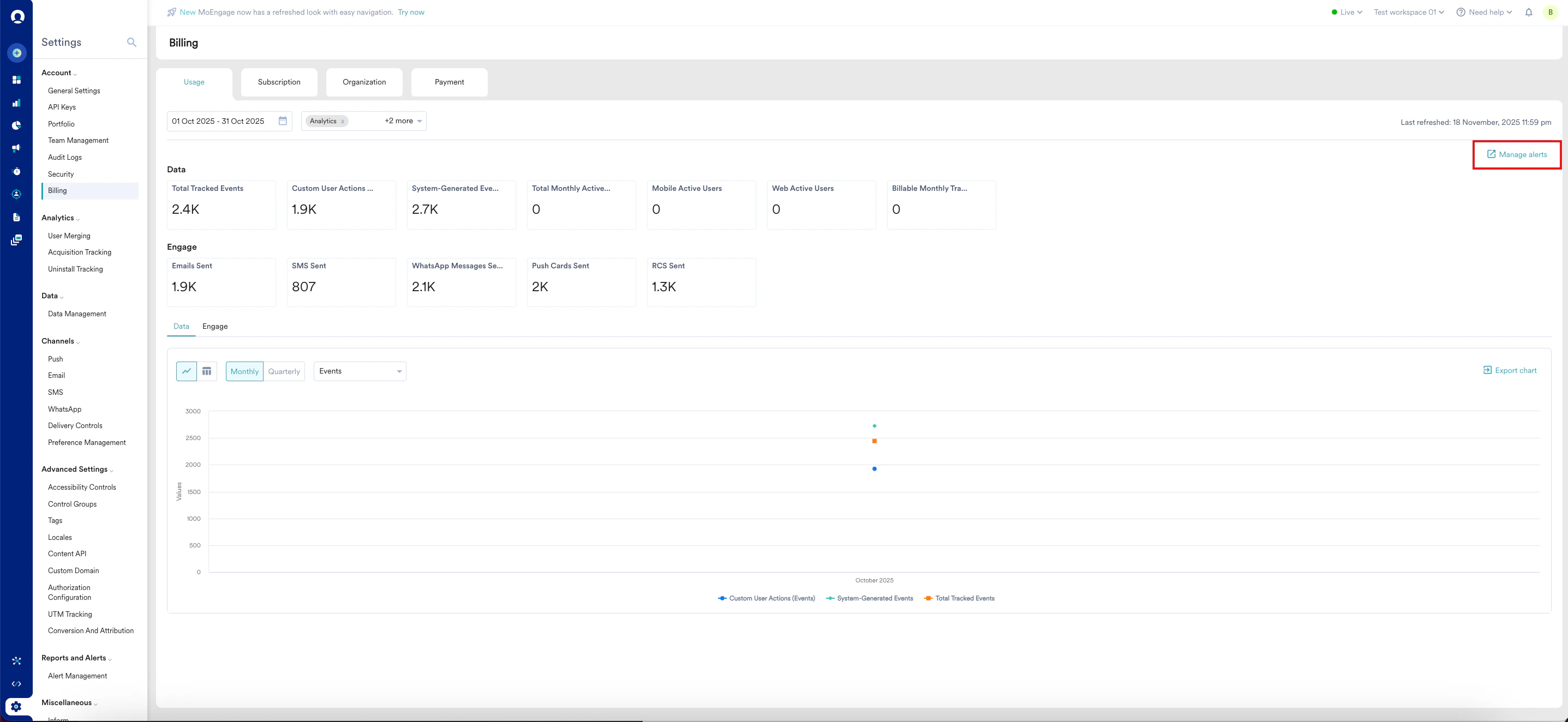 You can monitor your MoEngage services by creating custom alerts. This allows you to stay proactively aware of your usage trends and receive notifications when they exceed a defined limit, helping you avoid unexpected overages. To create an alert, perform the following steps:- Click + Manage Alert in the upper-right corner.