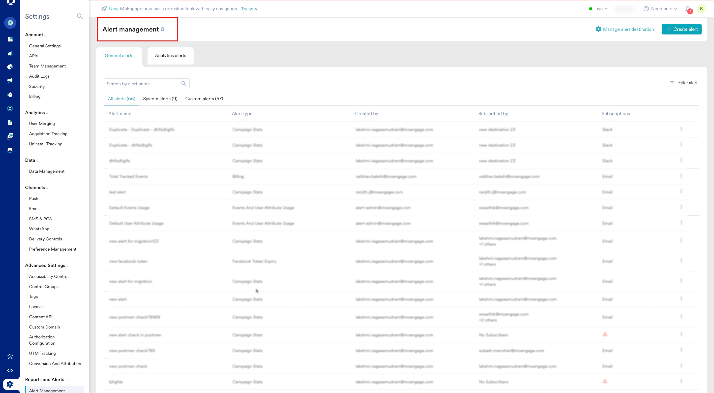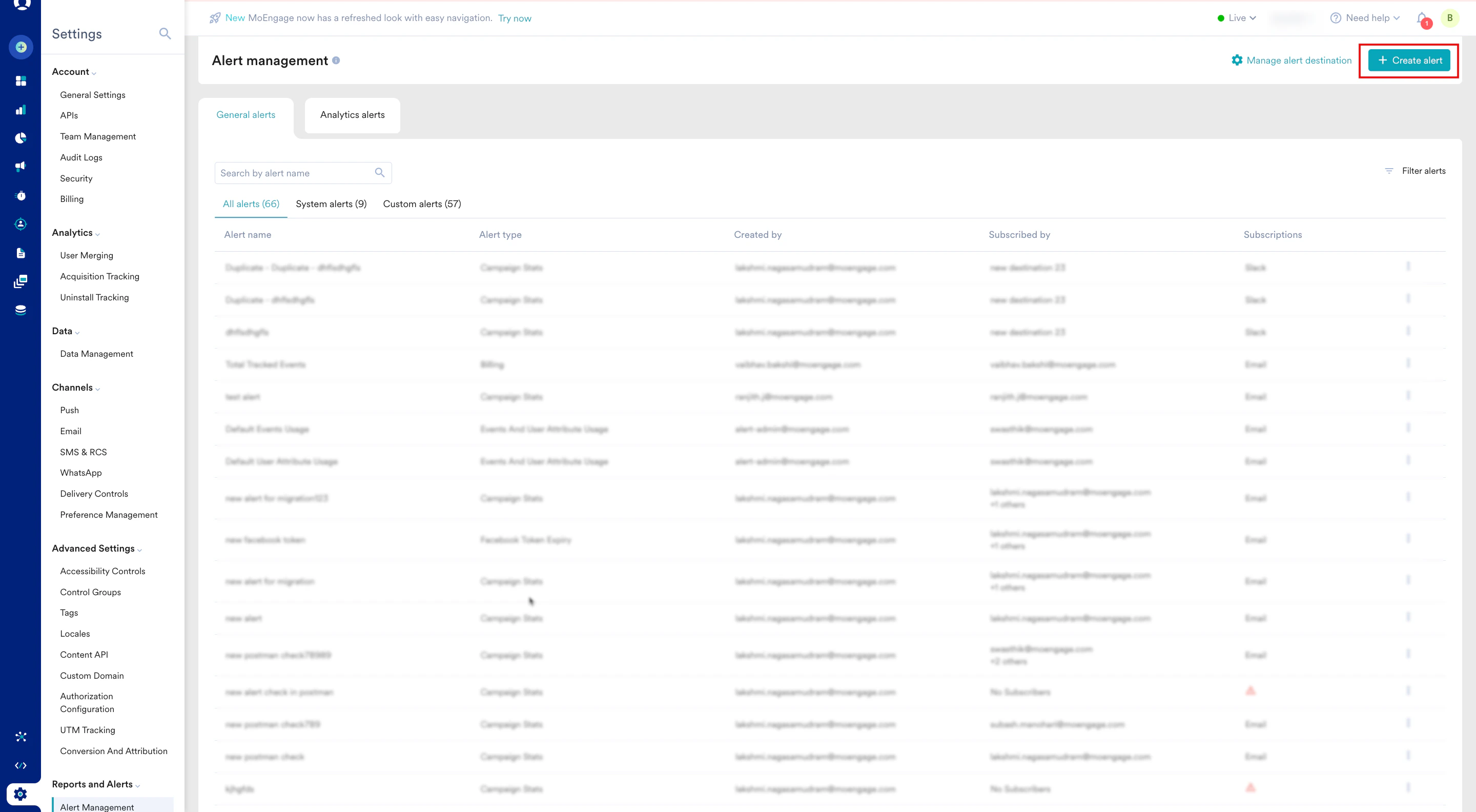 - MoEngage offers role-based permissions to create alerts. For more information, refer to Access Roles.