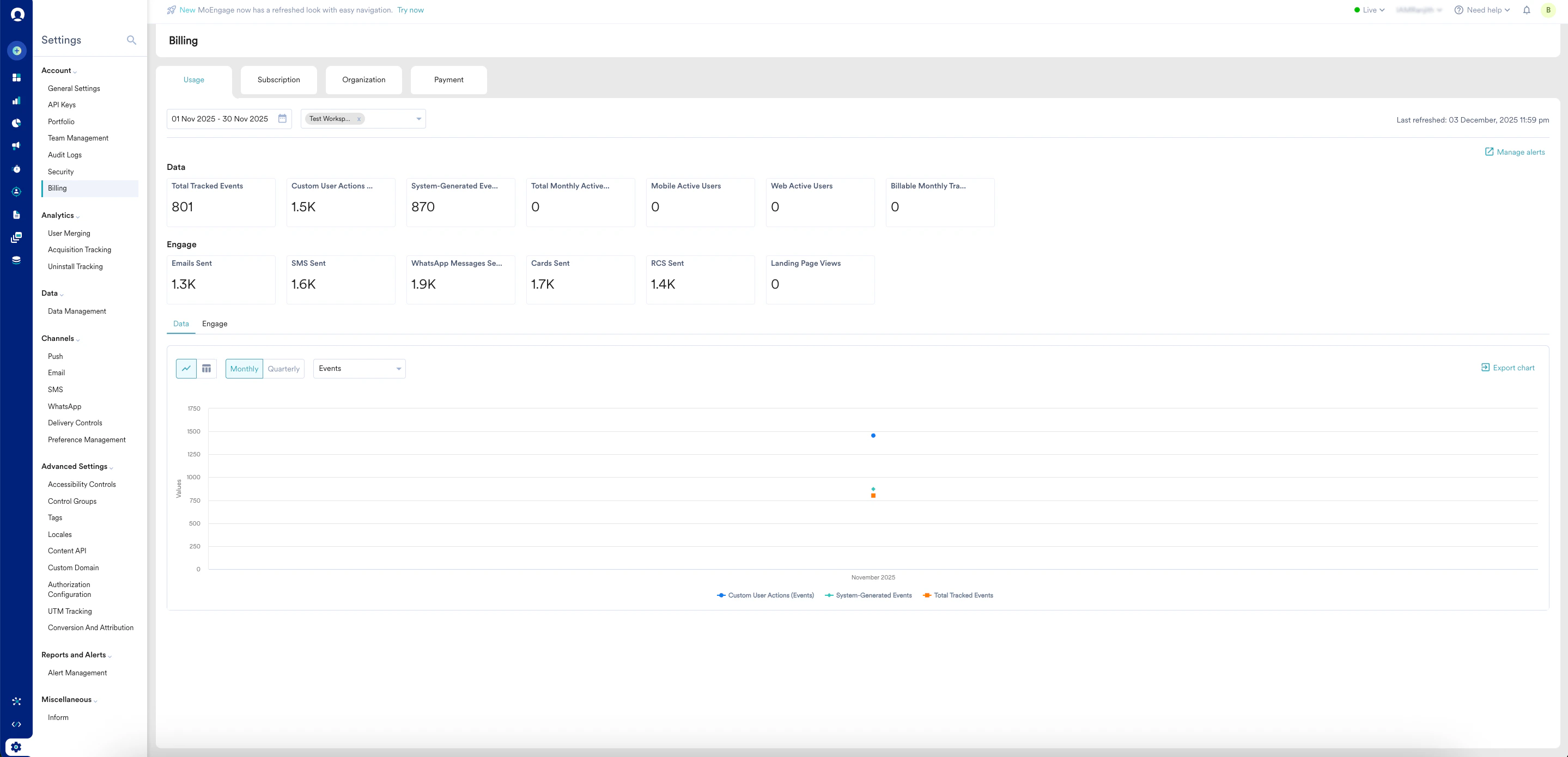 The Usage page helps you understand and track your monthly usage across various billing metrics, such as Custom User Actions (Events), System-Generated Events, Monthly Active Users (MAUs), Billable Monthly Tracked Users (MTUs), and more, across all workspaces. This enables you to manage your usage patterns and build transparency in billing. The following image shows the Usage dashboard: