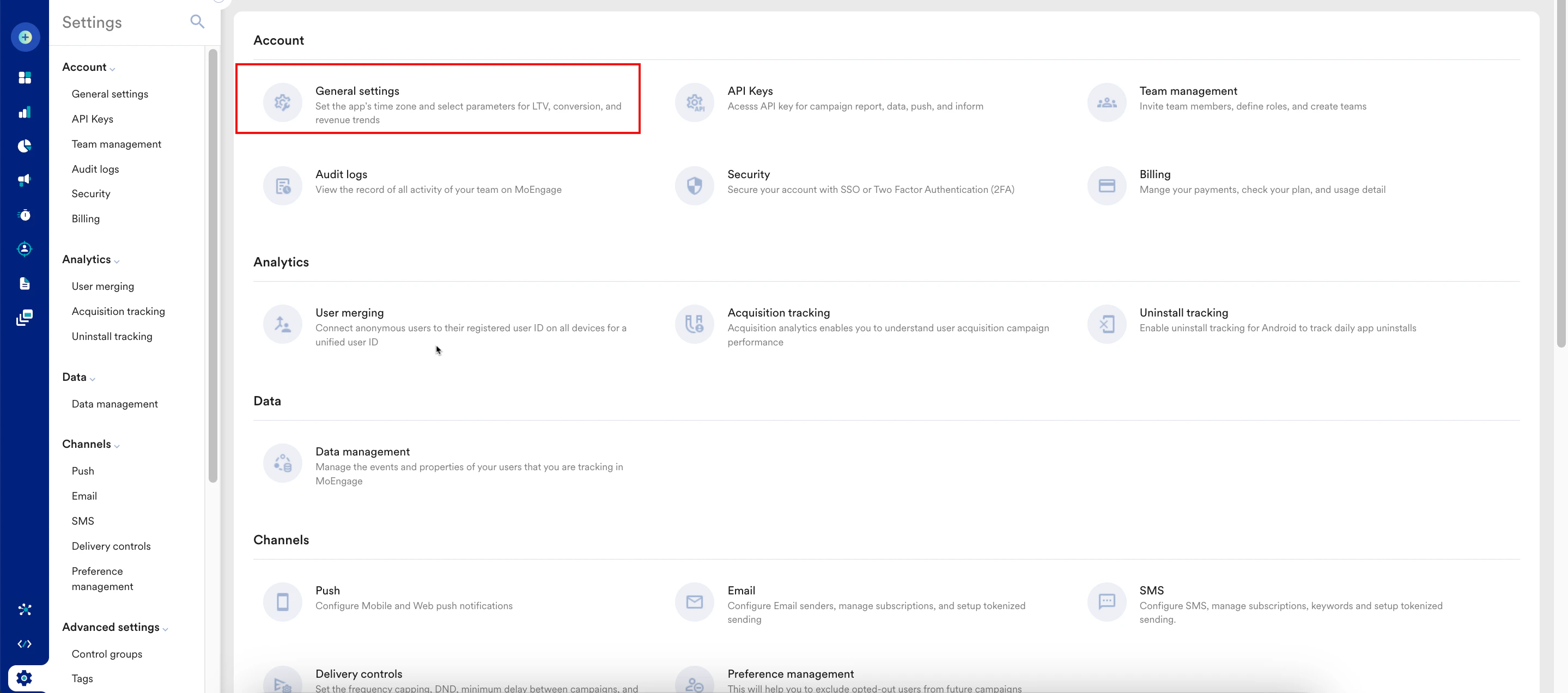 Perform the following steps to configure your workspace settings:- On the left navigation menu in the MoEngage dashboard, click Settings > Account > General settings.