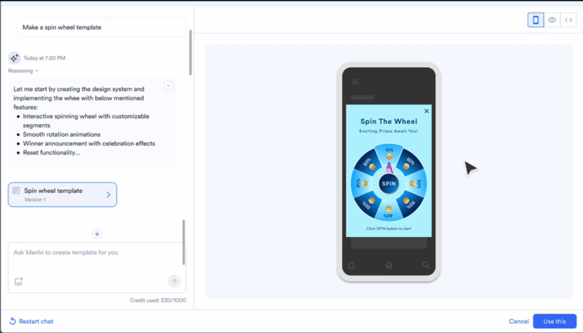 Create custom, on-brand In-App templates with simplate natural language prompts with Merlin AI Template Generator. No coding required—just instant engagement.