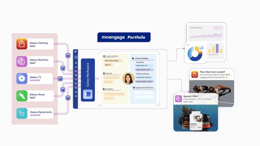 Bring all customer data across your apps, brands, and regions into a single MoEngage account to get a unified customer view. Get business-wide insights and build cross-app journeys — all from one centralized place.
