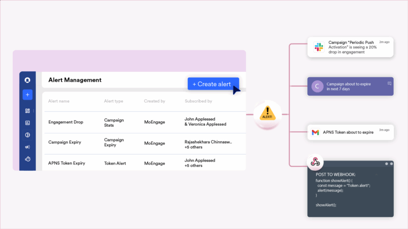 With MoEngage Alert Manager, receive real-time alerts on campaign performance or anomalies across Slack, MS Teams, email, or any webhook-enabled tool—helping you respond faster, collaborate better, and spot trends instantly.